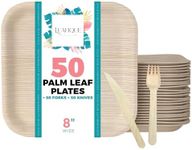 Leafique 8 Inch Disposable Square Palm Leaf 50 Plates + 100 Cutlery (50 Forks & 50 Knives) - Disposable Dinnerware for Birthday Party & Celebrations | Better Than Paper, Wood, Bamboo or Plastic Plates